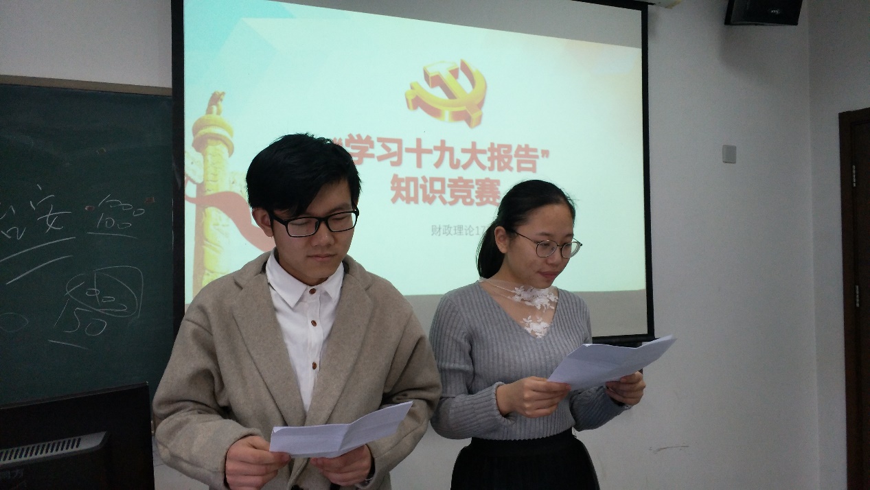2017年12月20日下午两点整,由中国公共财政与政策研究院财政理论17班级团支部筹划组织的十九大知识竞答活动在主教303准备就绪。同学们按照事先随机分成的小组坐定,四个小组长一手持笔,一手紧握抢答器,因紧张或激动而微微颤抖;其余同学有的眉头微蹙,有的眼神中却散发出自信的光芒。